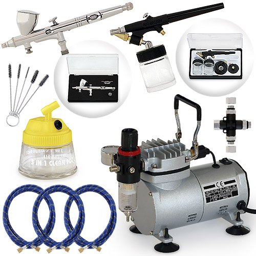 This premium two airbrush kit with piston compressor and cleaning station is perfect for a variety of applications; models, crafts, auto & cycle graphics, taxidermy, photo retouching, t-shirts, murals, fine art & illustrations, cake decorating and more. Package includes a PointZero Elite-125X air compressor, PZ-360 and PZ-276 airbrushes, 3-in-1 cleaning pot, 3-way splitter, brush set, and 3 braide